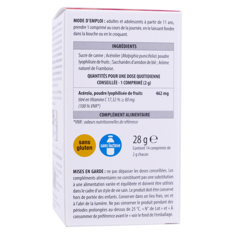 Pour 1 comprimé (2 g) : Acérola, poudre lyophilisée de fruits 462 mg titré en vitamine C 17,32 % ≥ 80 mg (100 % VNR*). *VNR : Valeurs Nutritionnelles de Référence