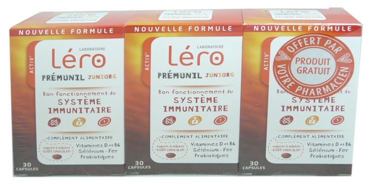 Le laboratoire LERO, expert en nutrition-santé, développe des compléments alimentaires associant des oméga 3 à des vitamines et des oligoéléments, afin d’offrir une efficacité optimale et contribuer au maintien de la santé et du bien-être. La gamme ACTIV’ propose de produits conçus pour apporter une réponse efficace aux besoins ponctuels : fatigue, inconfort digestif, jambes lourdes…. LERO PREMUNIL Junior du Laboratoire LERO est un complément alimentaire spécialement formulé pour maintenir le bon fonctionnement du système immunitaire de l’enfant notamment en période hivernale. Sa formule est composée de vitamines D, B6, E, fer, cuivre, zinc, sélénium, et de souches probiotiques Lactobacillus Casei spécialement sélectionnées pour renforcer efficacement les défenses immunitaires naturelles de l’enfant. Capsules à mâcher goût chocolat/noisette.