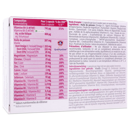 Conditionné sous forme de capsules, il est spécialement formulé avec des omégas 3 , des vitamines et des minéraux.. Il contient de la Vitamine B9 (acide folique ou folates) qui contribue à la croissance des tissus maternels, du chrome qui contribue au maintien d'une glycémie normale et du magnésium pour participer à la réduction de la fatigue Sa nouvelle formule Qualité (Huiles made in France), Sécurité (Quality Silver) et Respect des ressources marines (Accrédité Friend of the Sea), répond aux dernières normes européennes de recommandations.