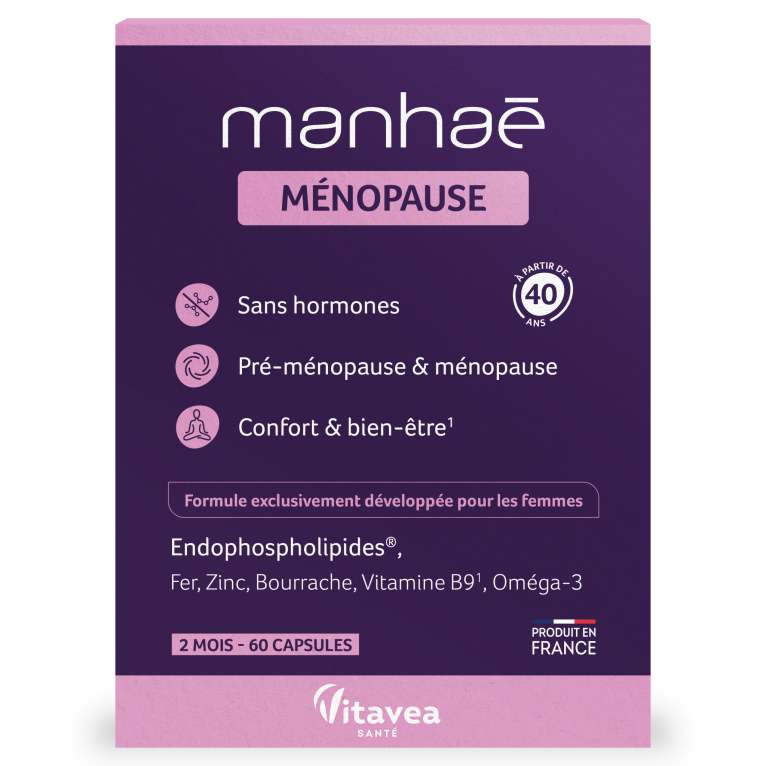 Les laboratoires VITAVEA proposent une gamme complète de produits spécialement dédiée à la femme, composée notamment de compléments nutritionnels, tisanes et infusions. La gamme MANHAE propose des produits exempts d’hormones de synthèse ou végétales pour accompagner naturellement les femmes en phase de pré-ménopause ou ménopause. La formule de MANHAE est composée d’Endophospholipides® qui sont des lipides complexes nommés phospholipides qui contiennent des acides gras polyinsaturés (EPA et DHA) à longue chaîne de la famille des Oméga-3, de la vitamine B9, du fer qui aide à réduire la fatigue, ainsi que des vitamines E et du Zinc qui contribuent à la protection des cellules contre le stress oxydatif. Le Zinc favorise également le maintien d'une peau, de cheveux et d'ongles normaux.