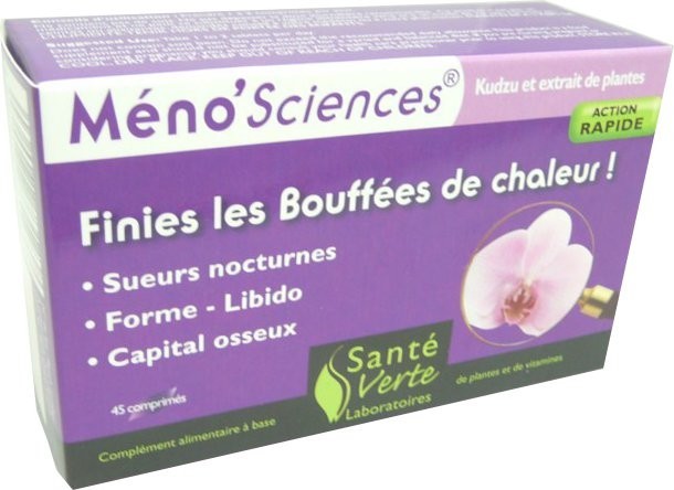 Santé verte propose des produits innovants et de haute qualité, composés de formules exclusives à base de plantes pour offrir des solutions naturelles à tous les besoins courants de santé. MÉNO'SCIENCES® est un complexe de 12 actifs destiné à accompagner de façon naturelle les femmes en période de ménopause, lorsque interviennent des bouleversements hormonaux importants. La sauge apaisante, plante reconnue pour son action bienfaisante au moment de la ménopause, est associée à un complexe de plantes et de vitamines destiné à améliorer le confort des femmes matures. L’angélique chinoise, le Kuzdu, le gattilier et la salsepareille permettent de diminuer les bouffés de chaleurs, les sueurs nocturnes et stimulent la libido. La vitamine D et le zinc contribue au maintien d’une ossature solide limitant les ainsi risques d'ostéoporose.