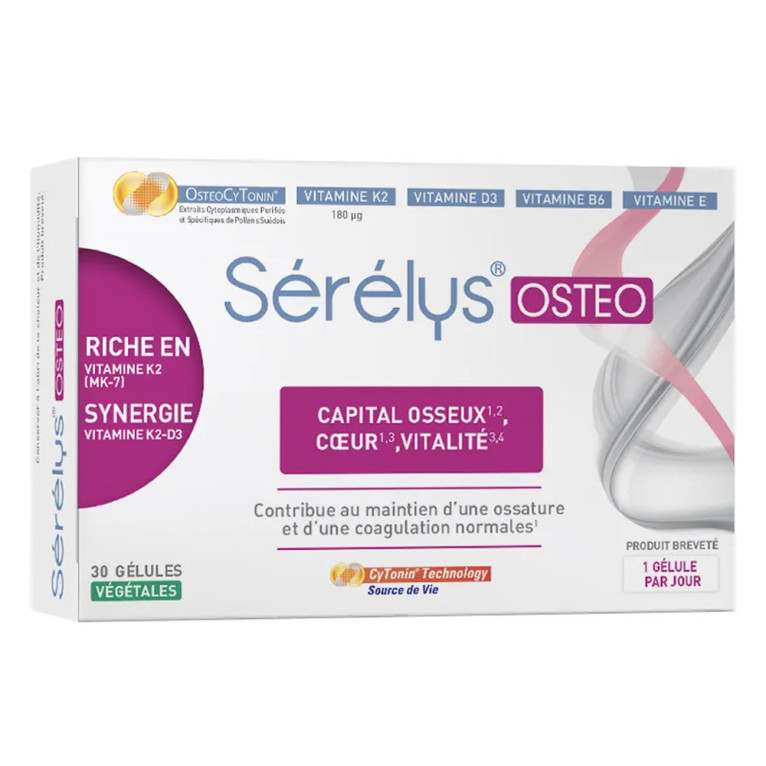 Serelys OSTEO est un complément alimentaire sous forme de gélules végétales à avaler, composé de 2 complexes OsteoCyTonin et de vitamines. La formule de ce complément alimentaire associe des vitamines K, D, et B6 ainsi qu’un extrait de pollen. La vitamine K (sous forme de vitamine K2) participe au maintien d’une ossature normale et d'une coagulation sanguine normale, la vitamine D (sous forme de vitamine D3) contribue à une absorption et une utilisation normale du calcium ainsi qu’au maintien d’une ossature normale. La vitamine B6 favorise un métabolisme normal de l'Homocystéine et aide à réduire la fatigue. Enfin la formule est complétée par de la vitamine E qui contribue à protéger les cellules contre le stress oxydatif. Les extraits de pollens (OsteoCyTonin Complex PI &GC) contribuent à la résistance du corps et favorisent la vitalité. Ne contient ni gluten ni lactose. Sans hormones, sans activité phytoestrogénique (soja, lin, sauge, citroflavonoïdes de citrus...). Sans mécanisme d'action hormonale. Sans béta-carotène.