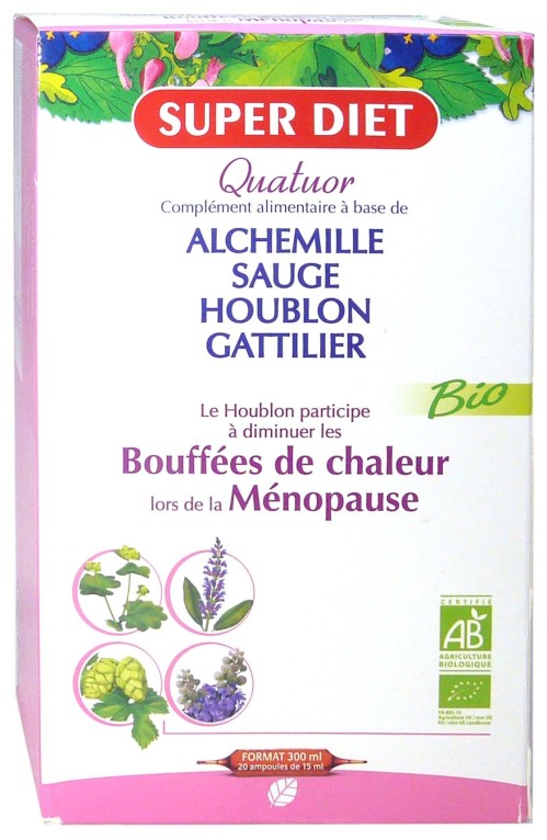 Quatuor Ménopause de SUPERDIET, est un complément alimentaire à base d'houblon, qui aide à diminuer les bouffés de chaleur, et d'alchémille, qui contribue à la microcirculation. Viennent s'ajouter à ce complément alimentaire, de la sauge, qui aide à gérer les transpirations excessives, et le gattilier.