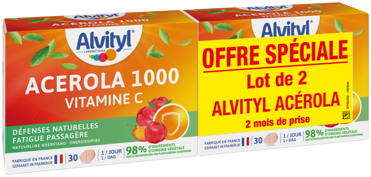 ACEROLA 1000 Vitamine C ALVITYL est formulé à partir de jus concentré d’acérola, qui est un fruit riche en vitamine C. Chaque comprimé à croquer au goût cerise, apporte 180 mg de VITAMINE C, et couvrant 225 % des valeurs nutritionnelles de référence journalière en vitamine C. La VITAMINE C contribue à réduire la fatigue et au fonctionnement normal du système immunitaire de l'organisme. 98% d’ingrédients d’origine végétale.