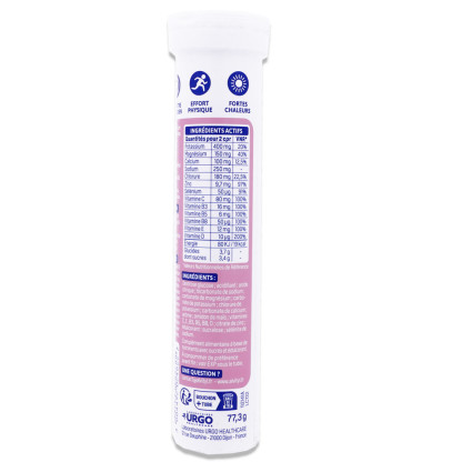 Complément alimentaire avec sucres et édulcorant, à base de vitamines, minéraux et électrolytes, Dextrose glucose ; acidifiant : acide citrique ; bicarbonate de sodium ; carbonate de magnésium ; carbonate de potassium ; chlorure de potassium ; carbonate de calcium ; arôme ; amidon de maïs ; vitamines C, E, B3, B5, B8, D ; citrate de zinc ; édulcorant : sucralose ; sélénite de sodium.