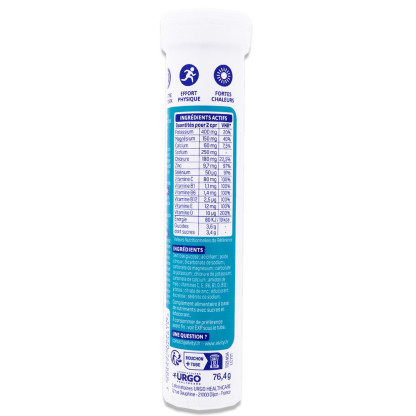 Complément alimentaire avec sucres et édulcorant, à base de vitamines, minéraux et électrolytes, Dextrose glucose ; acidifiant : acide citrique ; bicarbonate de sodium ; carbonate de magnésium ; carbonate de potassium ; chlorure de potassium ; carbonate de calcium ; amidon de maïs ; vitamines C, E, B6, B1, D, B12 ; arômes ; citrate de zinc ; édulcorant : sucralose ; sélénite de sodium.