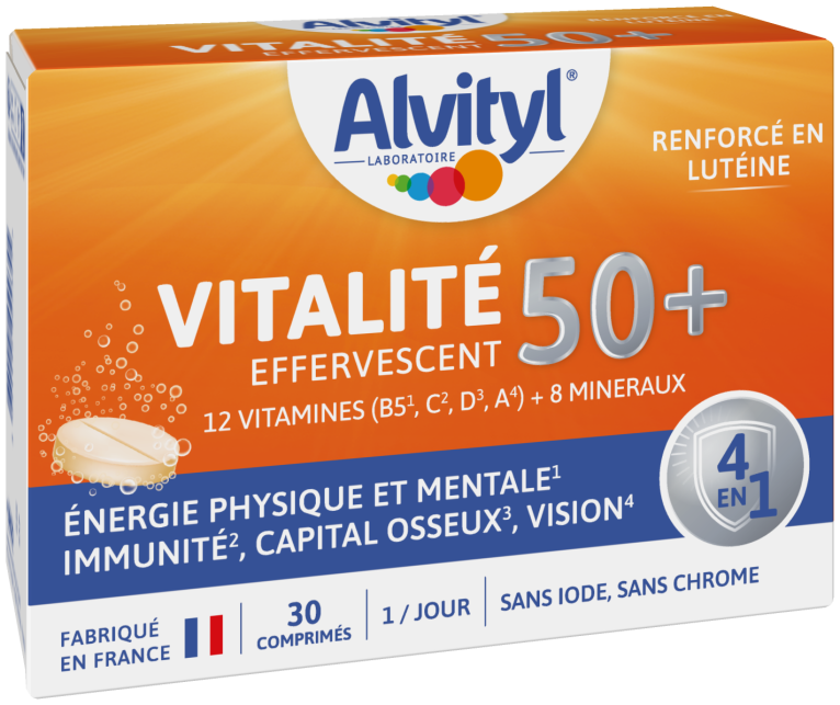 ALVITYL VITALITÉ EFFERVESCENT 50+ des laboratoires URGO, spécialement conçu pour les plus de 50 ans, offre une combinaison de 12 vitamines, 8 minéraux et des extraits végétaux tels que le ginseng, la lutéine et la myrtille, est en vente en ligne sur le site de votre parapharmacie à prix pas cher.