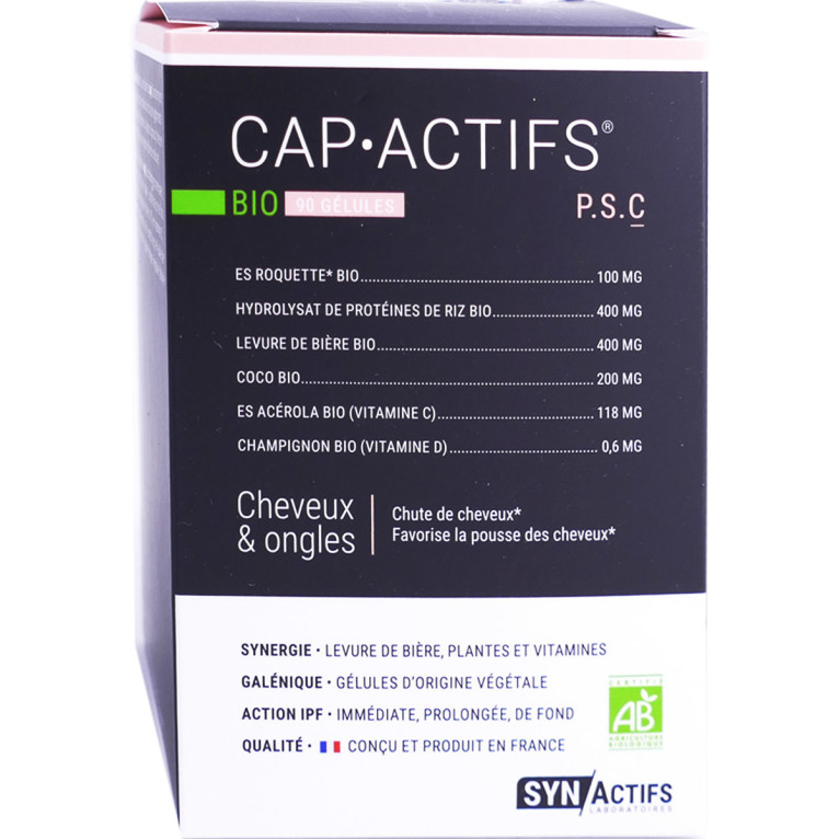 CAP ACTIFS Bio Cheveux et Ongles discount des laboratoires SYNactifs, un complément alimentaire Bio à base d'extrait sec de roquette pour participer à la stimulation du bulbe pileux et favoriser la croissance des cheveux, dans votre parapharmacie en ligne à prix discount.