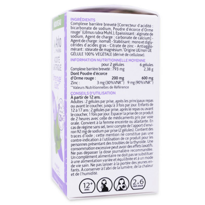 Il associe un complexe barrière breveté à base d’Orme rouge et du Zinc. L'Orme rouge, qui est une source de mucilages, participe à calmer le tube digestif et soutient les muqueuses digestives, tandis que le Zinc soutient le métabolisme acido-basique normal. Ensemble, ces ingrédients contribuent à un confort digestif optimal.