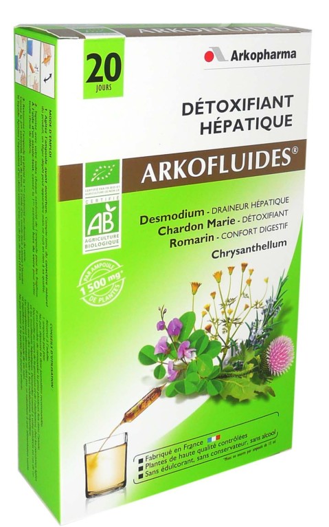 Le laboratoire ARKOPHARMA conçoit des compléments alimentaires et dispositifs médicaux à base de plantes naturelles dans des gélules pour offrir beauté, soins, et bien être. DETOXIFIANT HEPATIQUE Arkofluide d’ARKOPHARMA est un complément alimentaire à base d’extraits de chardon marie, romarin, chrisanthellum et desmodium pour drainer et protéger le foie afin d’éliminer les toxines et assurer son bon fonctionnement ainsi que la fonction biliaire