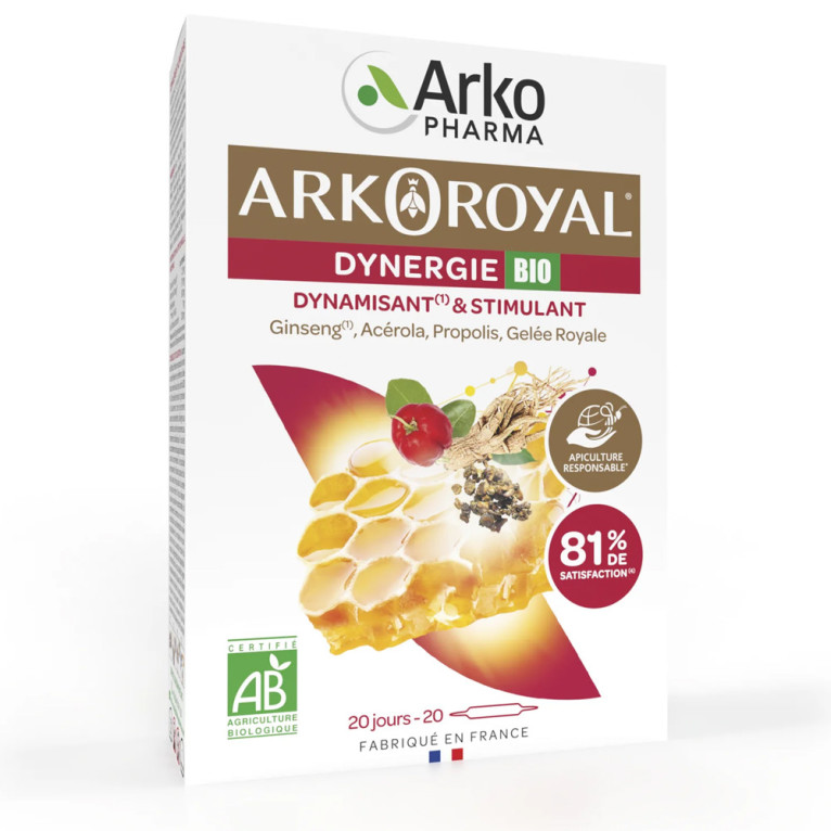 Ce complément alimentaire est idéal pour les périodes de stress ou de surmenage, ou tout simplement pour retrouver de l'énergie au quotidien. Essayez Arkoroyal Dynergie Bio et retrouvez votre vitalité !