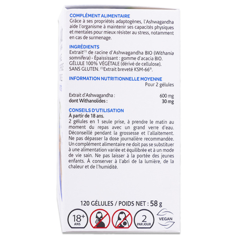 Pour 2 gélules : Extrait d'Ashwagandha 600 mg dont withanolides 30 mg.