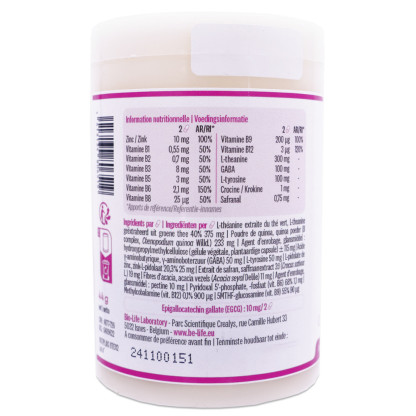 Complément alimentaire à base de L-theanine geëxtraheerd uit groene thee 40%, Quinoa poeder (B complex, Chenopodium quinoa Willd.), glansmiddel: hydroxypropylmethylcellulose (plantaardige capsule), y-aminoboterzuur (GABA), L-tyrosine, Zink-L-pidolaat 20,3%, Saffraanextract 3:1 (Crocus sativus L.) Acacia vezels (Acacia seyal Delile), glansmiddel: pectine, Pyridoxal 5'-fosfaat (vit. B6) 68%, Methylcobalamine (vit. B12) 0,1%, Glucosamine 5-methyltetrahydrofolaat (vit. B9) 55%.