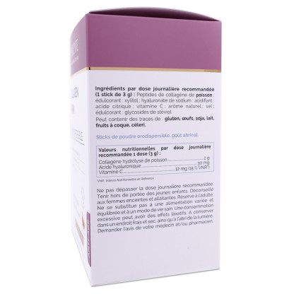 Pour 1 stick de 3 g : Collagène hydrolysé de poisson : 2 g ; Acide hyaluronique : 30 mg ; Vitamine C : 12 mg (15 % VNR*). *VNR : Valeurs Nutritionnelles de Référence