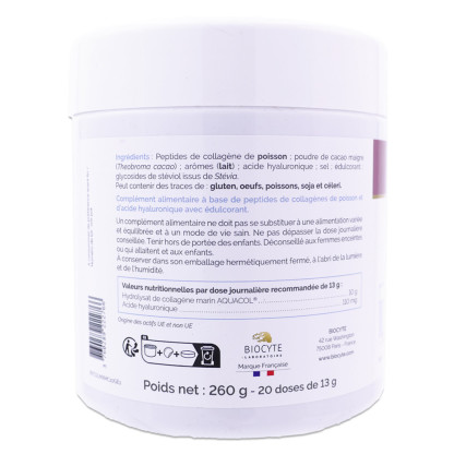 Biocyte, spécialiste de la nutricosmétique, propose une formule innovante alliant acide hyaluronique et collagène marin AQUACOL® de type I à faible poids moléculaire (2000 Da).