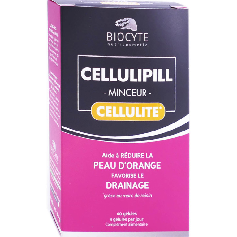 CELLULIPILL MINCEUR CELLULITE de BIOCYTE Nutricosmetic, le complément alimentaire sous forme de gélules à base de Marc de Raisin qui aide à réduire la peau d'orange et à favoriser le Drainage, dans votre parapharmacie en ligne à prix discount.