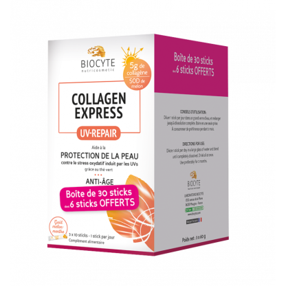 COLLAGEN EXPRESS UV-REPAIR discount de BIOCYTE, le complément alimentaire à base de thé vert qui aide à lutter contre le stress oxydatif dû aux rayons UV dans votre parapharmacie en ligne à prix discount.