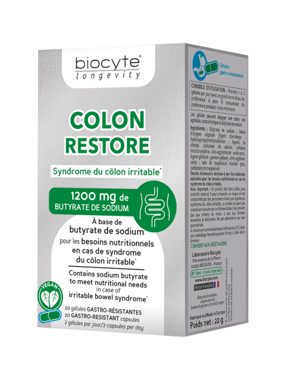 BioCyte Colon Restore est une Denrée Alimentaire Destinée à Des Fins Médicales Spéciales (DADFMS) qui contient du butyrate de sodium. Ce produit répond aux besoins nutritionnels des personnes souffrant du syndrome du côlon irritable. Le butyrate de sodium est un acide gras produit par les bactéries présentes dans l'intestin à partir des fibres alimentaires provenant des céréales, des fruits et des légumes. Il sert de principale source d'énergie pour les cellules tapissant le côlon, appelées colonocytes. La gélule de BioCyte Colon Restore est végétale et gastro-résistante, ce qui permet de protéger les actifs du produit contre les enzymes gastriques et de les libérer directement dans le colon. Faciles à prendre, les gélules BioCyte Colon Restore s'intègrent parfaitement à votre routine quotidienne. Cette Denrée alimentaire à des Fins médicales vous offre une solution naturelle et efficace pour retrouver un confort intestinal optimal. Commandez dès maintenant sur notre site de vente en ligne et profitez de prix discount.