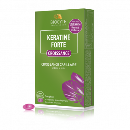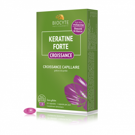 La gamme KERATINE de BIOCYTE vient en complément de la kératine déjà présente dans la fibre capillaire et les ongles pour leur redonner de leur beauté lorsqu’elle est insuffisante. KERATINE FORTE Croissance est à base d'un complexe de miliacine issu du millet, d'Hydrolysat de Kératine, et de plante (prêle). Ce complément alimentaire s'adresse aux personnes qui souhaitent favoriser la croissance et améliorer la beauté de leurs cheveux. La prêle participe à la croissance et contribue au renforcement des cheveux.