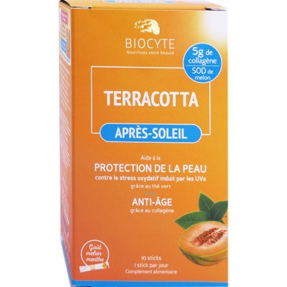 TERRACOTTA Après Soleil discount de Biocyte, un complément alimentaire à base de collagène et de Thé Vert qui aide à la protection de la peau contre le stress oxydatif, dans votre parapharmacie en ligne à prix discount.