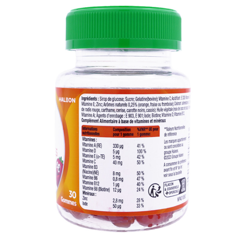 Sirop de glucose ; Sucre ; Gélatine (bovine) ; Vitamine C ; Acidifiant : E 330 ; Vitamine B3 ; Maltodextrine ; Vitamine E ; Zinc ; Arômes naturels 0,25% (orange, fraise ou framboise) ; Colorants alimentaires 0,15% (concentré de radis rouge, carthame, cerise, carotte noire, cassis) ; Huile végétale (noix de coco et colza) ; Vitamine B6 ; Vitamines A ; Agents d’enrobages : E 903, E 901 ; Iode ; Biotine ; Vitamine D ; Vitamine B12.