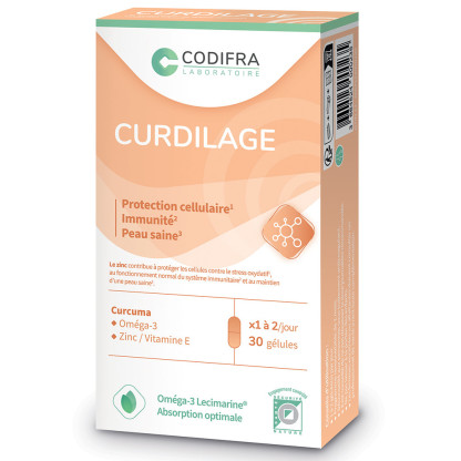 Curdilage est composé de lécithine marine, de curcuma, de vitamine E et de zinc. Sa formulation à base de vitamine D qui contribue à protéger les cellules contre le stress oxydatif et de zinc qui participe au fonctionnement normal du système immunitaire est complétée par du Curcuma et de la lécithine marine.