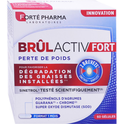 Depuis 1999, les Laboratoires FORTÉ PHARMA développent des compléments alimentaires efficaces et innovants, aux formules issues de la recherche en nutrition cellulaire, pour contribuer aux ressources vitales des utilisateurs. L’univers minceur de FORTÉ PHARMA propose des produits conçus pour accompagner la perte de poids en complément d’une alimentation adaptée et d’une activité sportive.Brûlactiv fort de FORTÉ PHARMA est un complément alimentaire conditionné sous forme de gélules spécialement formulé à base de guarana qui contribue au contrôle du poids et au métabolisme des graisses.La formule contient également du chrome qui permet le maintien d’une glycémie normale.