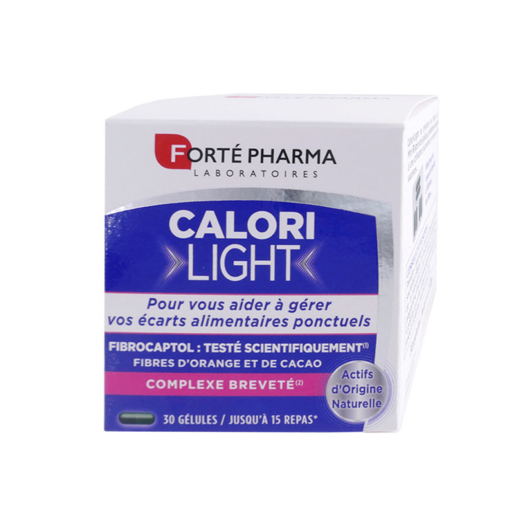 CALORILIGHT de FORTÉ PHARMA est un complément alimentaire conditionné en gélules, spécialement formulé pour vous accompagner lors d’écarts alimentaires ponctuels notamment en cas de repas copieux et trop riches en graisse. Composé d’une association spécifique de fibres d’orange et de cacao, actifs d'origine naturelles, au fort pouvoir lipo-absorbant*, le FIBROCAPTOL. Ce complément alimentaire contribue à capter 50 % des graisses* et à alléger vos repas. La solution à utiliser dans n’importe quelle circonstance sans culpabiliser ! *contenues dans 30g de foie gras ou 42g de crème fraîche. Etude d'efficacité de capture des graisses in Vitro I.P.I.B CL 09/2003 et 03/2004.