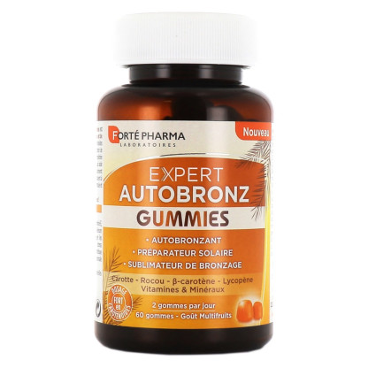 Forté Pharma Expert Autobronz Gummies 60 gommes en vente en ligne sur le site de votre parapharmacie à prix discount est un complément alimentaire à base de caroténoïdes, de pigments d'origine végétale, d'acide aminé, de vitamines et minéraux pour la beauté de la peau avant, pendant et après l'exposition au soleil !