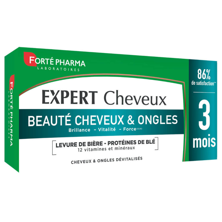 Depuis 1999, les Laboratoires FORTÉ PHARMA développent des compléments alimentaires efficaces et innovants, aux formules issues de la recherche en nutrition cellulaire, pour contribuer aux ressources des utilisateurs. L’univers Beauté de FORTÉ PHARMA propose des produits conçus pour préserver son capital beauté et se sentir bien dans sa peau tous les jours avec 3 gammes de produits et de compléments alimentaires pour vous aider à entretenir et sublimer votre peau (hydratation, fermeté, bronzage) et vos cheveux. EXPERT CHEVEUX de FORTÉ PHARMA est un complément alimentaire conditionné sous forme de comprimés, spécialement formulé pour contribuer à une chevelure plus belle, plus brillante et plus résistante. La formule innovante de EXPERT CHEVEUX associe des protéines de blé, du zinc et de la vitamine B6, des vitamines C, E et du sélénium antioxydants, de la levure de bière et des vitamines du groupe B pour participer à sublimer la beauté et la brillance des cheveux. La vitamine B8 (Biotine) contribue au maintien de cheveux normaux et le zinc et le sélénium contribuent au maintien de cheveux et d’ongles normaux.