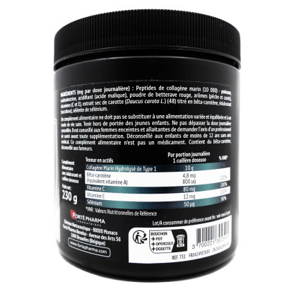 Teneur en actifs par portion journalière (1 cuillère doseuse) / % Valeurs Nutritionnelles de Référence : Collagène marin hydrolysé de Type 1 : 10 g ; Bêta-carotène : 4,8 mg équivalent vitamine A : 800 µg / 100% ; Vitamine C : 80 mg / 100% ; Vitamine E : 12 mg / 100% ; Sélénium : 50 µg / 90%