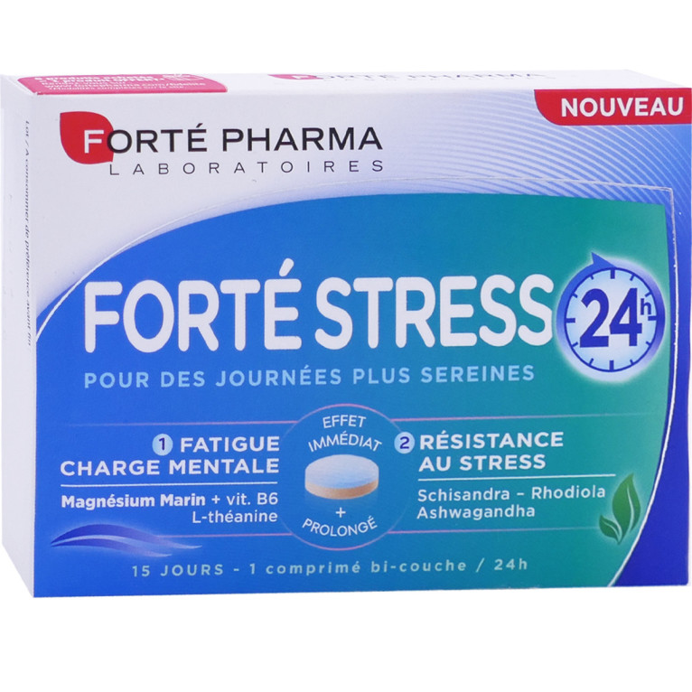 Depuis 1999, les Laboratoires FORTÉ PHARMA développent des compléments alimentaires efficaces et innovants, aux formules issues de la recherche en nutrition cellulaire, pour contribuer aux ressources des utilisateurs.L’univers Santé de FORTÉ PHARMA propose des produits conçus pour préserver le capital santé et se sentir bien au quotidien avec 4 gammes de produits et compléments alimentaires aux Défenses naturelles ,au Stress et sommeil, au Bien-être féminin et aux Enfants.FORTE STRESS 24H de FORTÉ PHARMA est un complément alimentaire conditionné sous forme de comprimés bi-couches, composé d’extraits de plantes, de minéraux et de vitamines. Chaque comprimé apporte du magnésium marin, des vitamines B, de l’acide aminé L-Théanine, et un complexe de 3 plantes (rhodiola, ashwagandha, schisandra). Le schisandra augmente la capacité d’une personne à s’adapter au stress et le magnésium et la vitamine B6 participent à la réduction de la fatigue et au fonctionnement normal du système nerveux. FORTE STRESS 24H est conditionné sous forme de comprimés bi-couches pour assurer une double diffusion des actifs : la première couche assure une diffusion immédiate, et la deuxième couche une diffusion progressive, permettant ainsi une action prolongée sur 24 heures.