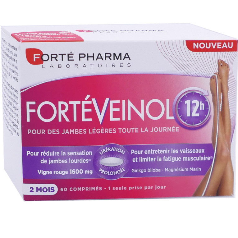 FortéVeinol est un complément alimentaire sous forme de comprimés à libération prolongée composé de 5 extraits de plantes (Marronnier d’Inde, Mélilot, Gingko biloba, Vigne Rouge, de vitamines (C et E) et de magnésium d’origine marine. La vigne rouge soutient la circulation veineuse et maintient l’intégrité de la bonne santé des vaisseaux et capillaires sanguins. Le magnésium contribue à réduire la fatigue et à une fonction musculaire normale. La vitamine B6 contribue à réduire la fatigue. Rapidement les jambes sont plus légères et moins douloureuses, pour longtemps grâce à sa diffusion continu pendant 12 heures.