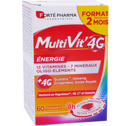 MULTIVIT’4G ENERGIE de Forte Pharma à prix discount, le complément alimentaire aux 12 vitamines, 7 minéraux et oligoéléments, en comprimés bicouches dans votre parapharmacie en ligne à prix discount. Format 2 mois 60 comprimés.
