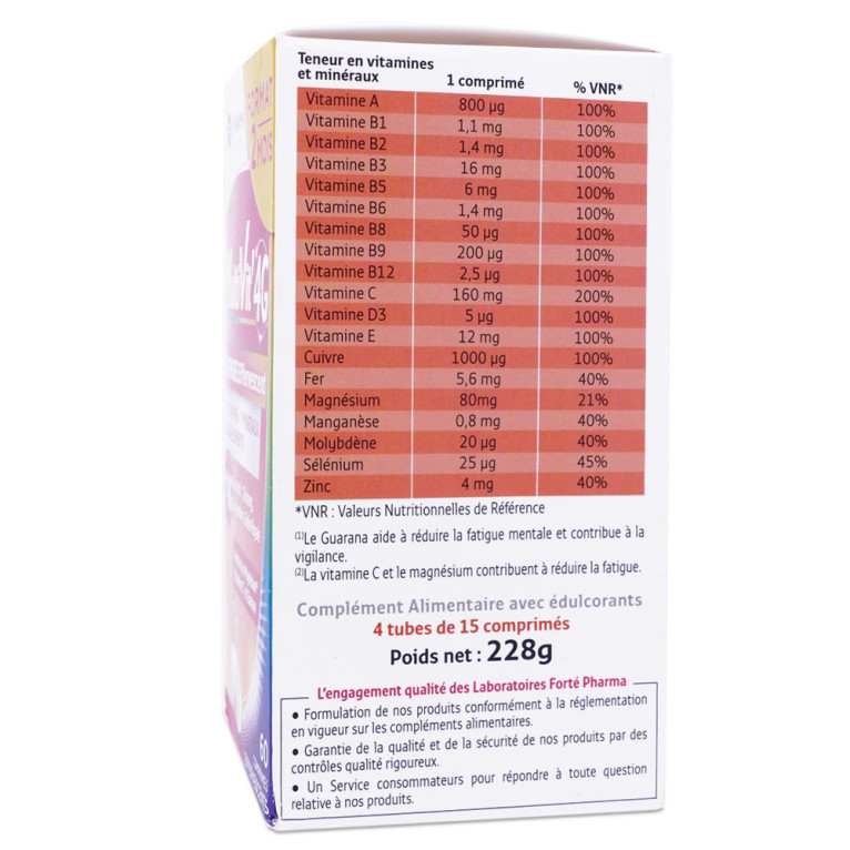 Ce produit, élaboré par le laboratoire Forte Pharma, contient un complexe de plantes 4G (ginseng, guarana, gelée royale, gingembre) avec un cocktail de vitamines et minéraux essentiels pour l'organisme : le guarana participe à réduire la fatigue mentale et contribue à la vigilance, tandis que la vitamine C et le magnésium contribuent à réduire la fatigue. Grâce à sa formule innovante, ces comprimés effervescents sont faciles à prendre grâce à leur goût à l'orange et agissent rapidement pour vous redonner vitalité et dynamisme.