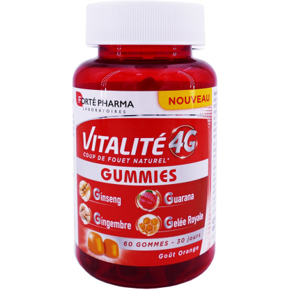 Formulé par le laboratoire Forte Pharma, ce complément alimentaire est spécialement conçu pour vous apporter une vitalité optimale. Les gummies Vitalité 4G renferment un complexe 4G qu contient une combinaison unique de 4 ingrédients essentiels et naturels : guarana, ginseng, gingembre, gelée royale. Ces délicieuses gommes à mâcher sont agréables à consommer par leur texture fondante et leur goût gourmand à l'orange. Le guarana contribue à réduire la fatigue et à la vigilance. Faciles à prendre, les gummies Vitalité 4G sont adaptés à tous les modes de vie. Que vous soyez actif, étudiant ou tout simplement en quête d'un regain d'énergie, ce complément alimentaire vous accompagnera tout au long de la journée. Ne laissez plus la fatigue vous ralentir, optez pour Vitalité 4G 60 Gummies !