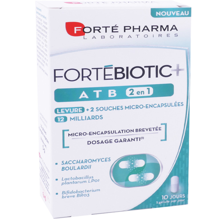 Depuis 1999, les Laboratoires FORTÉ PHARMA développent des compléments alimentaires efficaces et innovants, aux formules issues de la recherche en nutrition cellulaire. FortéBiotic+ ATB 2 en 1 est un complément alimentaire présenté sous forme de gélule végétale sans allergène, composé de 2 souches de ferments lactiques micro-encapsulées (Lactobacillus plantarum LP01 et Bifidobacterium breve BR03) combiné à de la Levure (Saccharomyces boulardii) qui agissent ensemble.