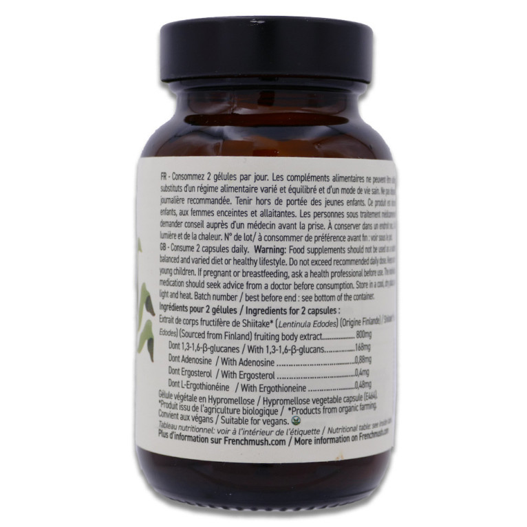 Chaque gélule contient du shiitake biologique, un champignon riche en nutriments. Les Japonais le désignent sous le nom de ""champignon des Samouraïs"" et il est également connu sous l'appellation ""Lentin de chêne"". Le shiitake contient une substance appelée lentinane, qui est un polysaccharide précieux. Ce champignon constitue une source significative de vitamines, de minéraux et d'oligoéléments. Il est reconnu pour ses propriétés nutritionnelles en raison de sa richesse en molécules bioactives, notamment les polysaccharides et, en particulier, les bêta-glucanes. En intégrant ce complément dans votre routine, vous bénéficiez des propriétés naturelles du shiitake, qui soutient la vitalité générale de l'organisme. Ce produit est idéal pour ceux qui cherchent à maintenir leur bien-être au quotidien.