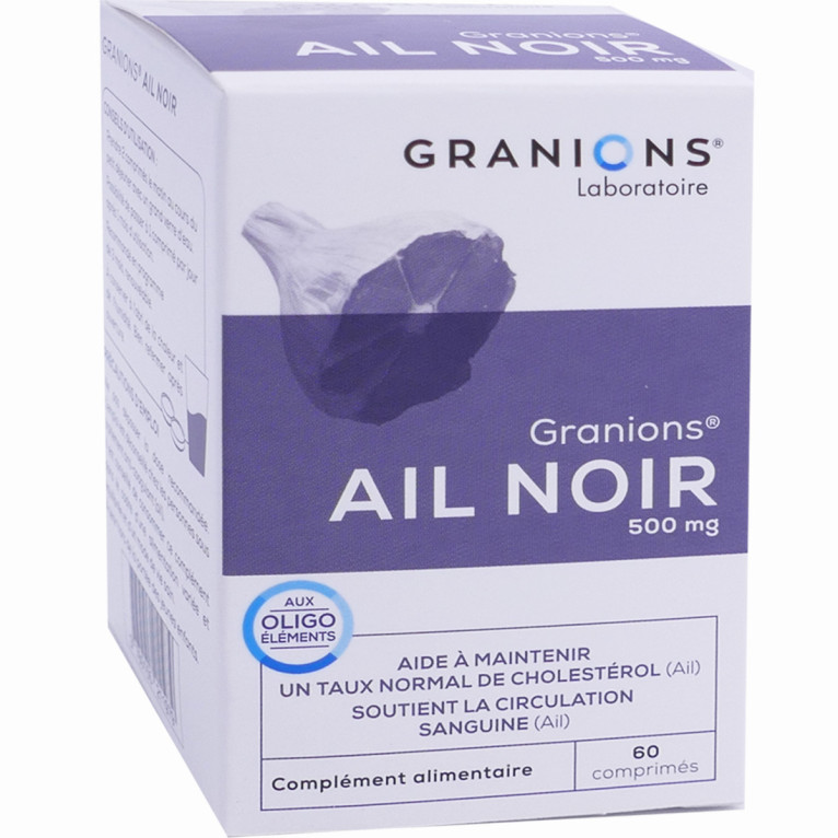L’Ail Noir de GRANIONS est un complément alimentaire sous forme de comprimés à avaler, composé d’extrait d’ail noir.L'ail soutient le maintien de la santé cardiaque et le taux normal de cholestérol.Chaque comprimé contient 250 mg d'ail noir.