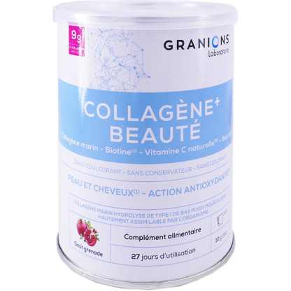 COLLAGENE + Beauté discount des Laboratoires GRANIONS, un complément alimentaire à base de collagène marin, biotine et vitamine, dans votre parapharmacie en ligne à prix discount.