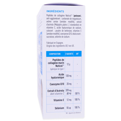 Peptides de collagène Naticol® (poisson), anti-agglomérant : carbonate de magnésium, arôme cerise (amidon modifié), extrait d’acérola (Malpighia glabra L.) standardisé en vitamine C, acide hyaluronique de sodium, colorant : poudre de betterave, vitamine E (amidon modifié), coenzymze Q10, édulcorant : sucralose, sélénite de sodium.