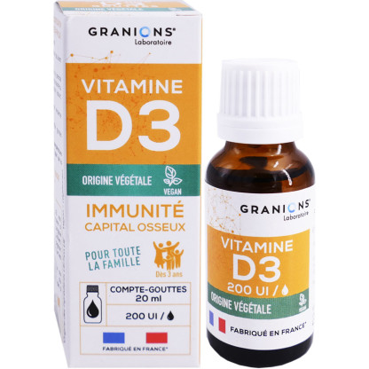GRANIONS VITAMINE D3 en vente en ligne sur le site de votre parapharmacie à prix discount, est un complément alimentaire en compte-gouttes à base de vitamine D3 d'origine végétale.