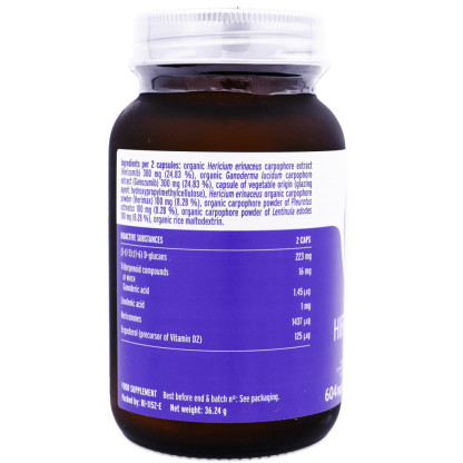 Ingrédients par gélule : 150 mg d’extrait d’Hericium erinaceus bio (Herizumib®), 150 mg d’extrait de Ganoderma lucidum bio (Ganozumib®), 50 mg de poudre d’Hericium erinaceus bio (Herimax®), 50 mg de poudre de Pleurotus ostreatus bio et 50 mg de poudre de Lentinula edodes bio.
