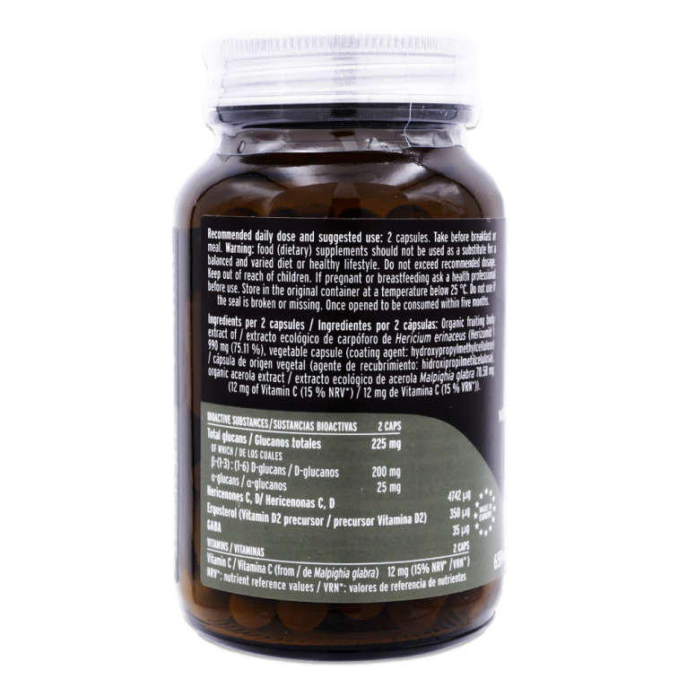 Ingrédients par gélule (677 mg) : Extrait biologique de sporophore de Hericium erinaceus 495 mg (73,12 %), acerola biologique Malpighia glabra (6 mg vitamine C), gélule végétale (agent d'enrobage : hydroxypropylméthylcellulose, eau purifiée et jus concentré de carotte violette)