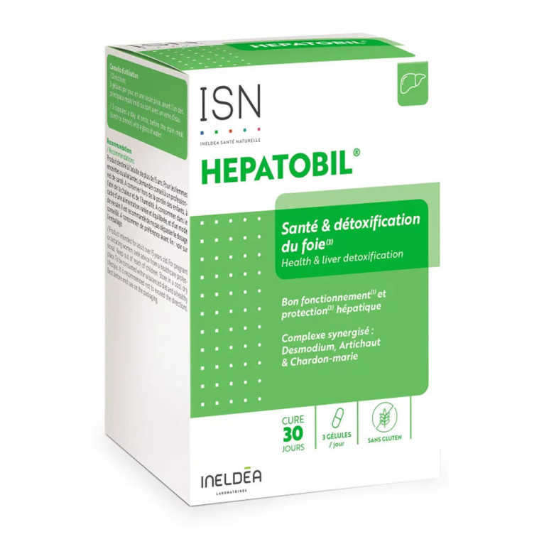 HEPATOBIL du laboratoire INELDEA à prix discount, en vente dans votre parapharmacie en ligne discount, un complément alimentaire sous forme de gélules formulées à base de Desmodium qui favorise le fonctionnement hépatique et contribue au drainage du foie.