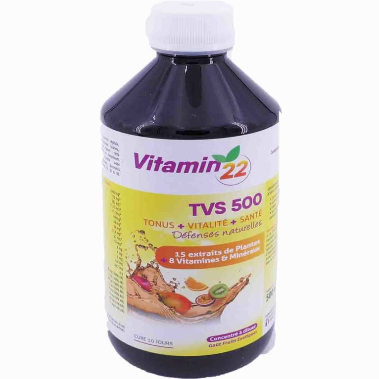 Vitamin 22 TVS500 discount d'Ineldea, un concentré à diluer au goût fruits exotiques formulé à base de 15 extraits de plantes, vitamines & minéraux, dans votre parapharmacie en ligne à prix discount.