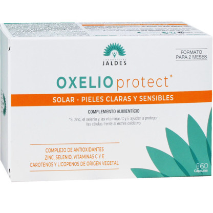 OXELIO Protect Solaire-Peaux Claires et sensible de JALDES de JALDES, est un complément alimentaire à base de zinc, de sélénium et des vitamines E et C, qui contribuent à protéger les cellules contre le stress oxydatif. Viennent s’ajouter à ce complément alimentaire de lycopène et de la carotène, qui aide à protéger la peau des rayons UV excessifs et des coups de soleil et qui favorise une pigmentation saine de peau et le bronzage.