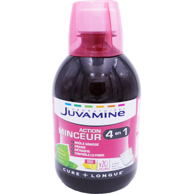 Juvamine action minceur 4 en 1 contient : Du Thé vert : il participe au métabolisme des graisses ; De l'Ortie : il favorise les fonctions d'élimination de l'organisme ; De l'Artichaut : il participe à la détoxification de l'organisme et permet de maintenir la santé du foie ; Du Fucus : il aide à contrôler le poids.
