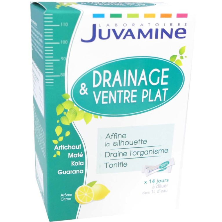 JUVAMINE DRAINAGE ET VENTRE PLAT est spécialement formulé à partir d’Artichaut : il participe à la détoxification de l'organisme et contribue au maintien d’un ventre plus plat tout en affinant la silhouette. La formule est complétée par du Maté qui facilite le drainage des tissus et par du Kola qui favorise la combustion des graisses.Ce complément alimentaire contient également du Guarana.Grâce à son format pratique en stick liquide à diluer, JUVAMINE DRAINAGE ET VENTRE PLAT s’emporte partout et se prépare instantanément.