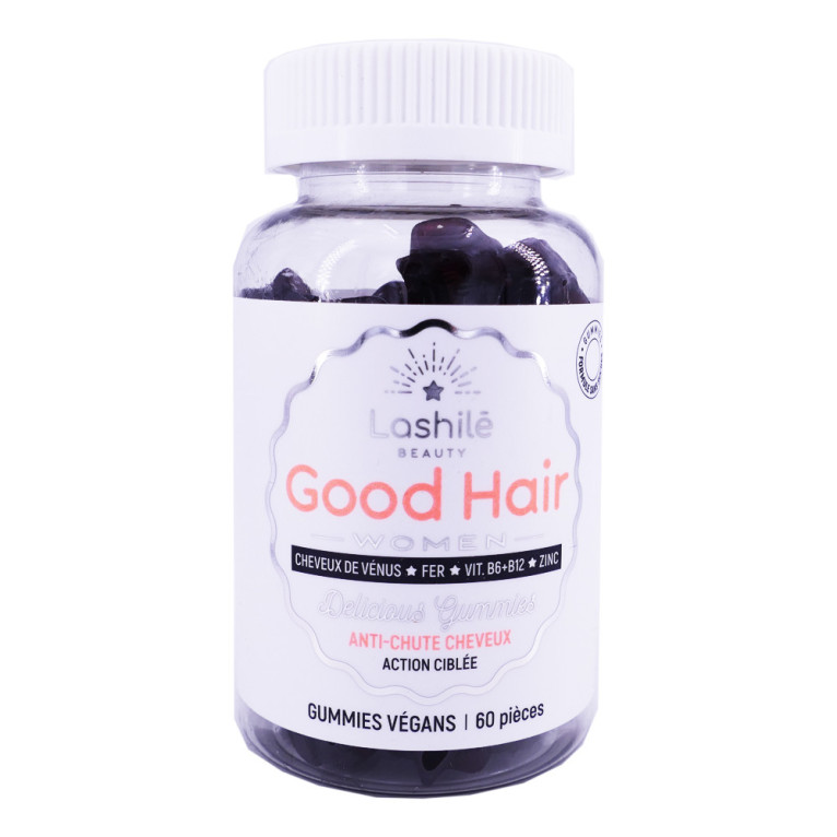 LASHILE GOOD HAIR WOMEN, le secret anti-chute des cheveux de la femme dans un complément alimentaire en gummies vitaminés à base plantes, de vitamine B6 et de Zinc qui contribue au maintien des cheveux normaux dans votre parapharmacie en ligne à prix discount.